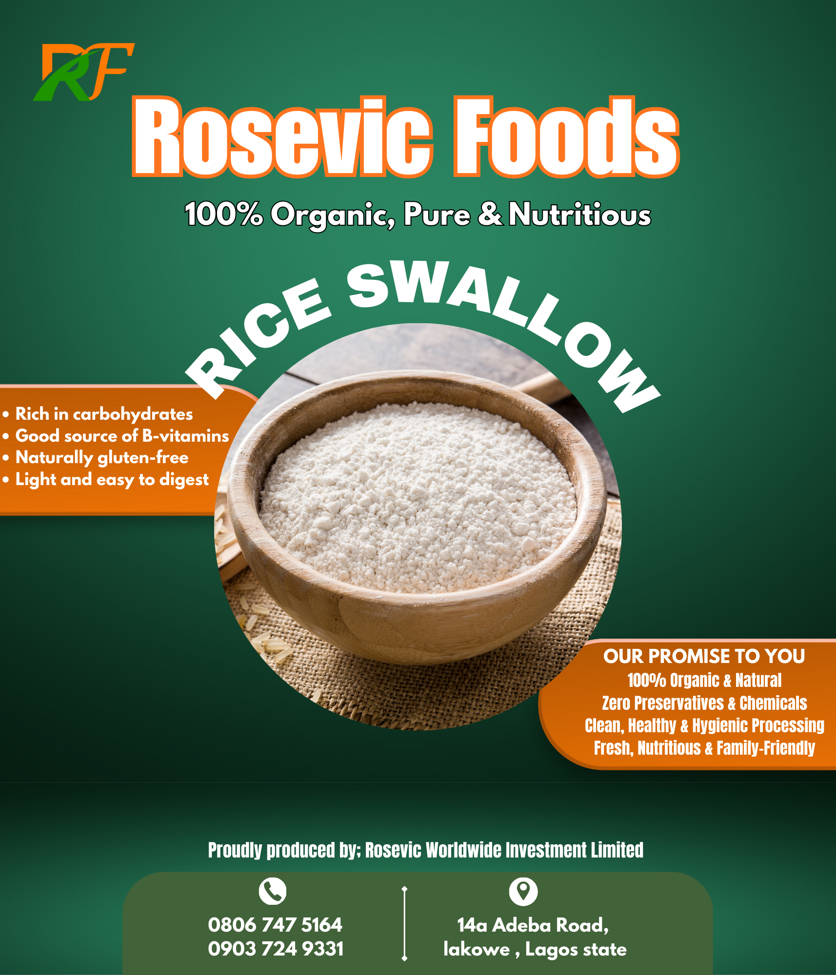 Rosevic Foods Rice Swallow is smooth, stretchy, and easy to prepare. Made from finely milled rice flour, it delivers soft texture and neutral taste, perfect for pairing with any soup. Ideal for those seeking a lighter alternative to traditional swallows, it cooks fast and digests easily. Hygienically processed for freshness and consistency, it guarantees a satisfying swallow experience.